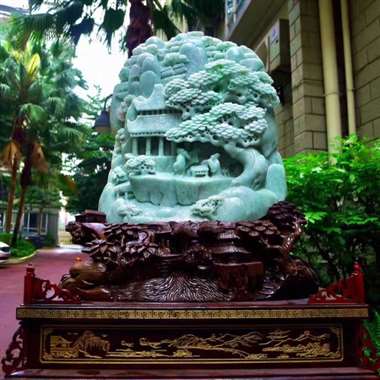 翡翠A货老坑水润满色豆绿精工松下老人,锦锈山河,山水摆件 约裸石尺寸:360/310/130 连底坐:650/500/300mm 重量:20.38公斤