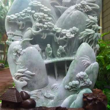翡翠A货老坑水润飘绿精雕松下老人指日高升山水摆件 约裸石尺寸:450/290/115 连底坐:630/335/240mm 重量:36斤左右