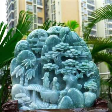 缅甸天然翡翠A货 精美冰糯 满绿 山水摆件 雕刻精美线条流畅种水好 层次分明 丰富多彩 搭配精美高档檀木底座 尺寸 380.310.130裸石尺寸220.230.40裸石重量9.24斤 送礼佳品