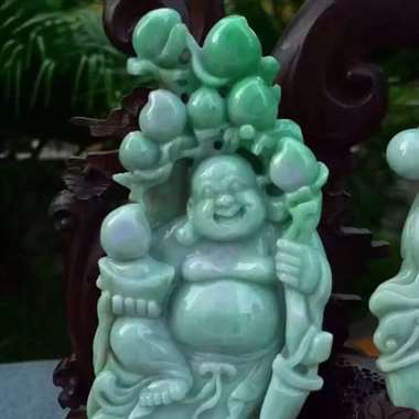 精美水润 春带彩 精美 福寿双全 笑口常开 财源滚滚 健康长寿 尺寸 430.330.138裸石尺寸 220.120.38。220.110.30搭配精美高档檀木底座 送礼佳品 福寿双全 健康长寿