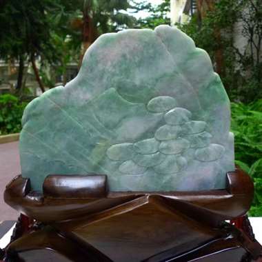 翡翠A货老坑水润春带彩精工山中访友山子摆件 约裸石尺寸:215/85/45 连底坐:330/140/