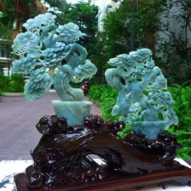 翡翠A货老坑水润特色蓝水双喜临门盆景摆件 约裸石尺寸:90/150/50 连底坐:200/205/1