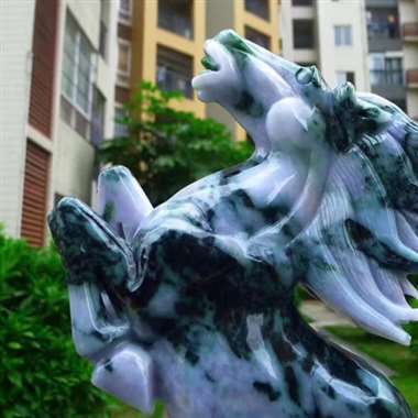 缅甸天然翡翠A货 精美水润 飘花 精美霸气 马上发财 一马当先 马到功成 升官发财 雕刻精美线条流畅种水好 搭配精美高档檀木底座 送礼佳品 大件 尺寸 490.258.140裸石尺寸 330.190.68裸石重量 10.29斤 送礼佳品