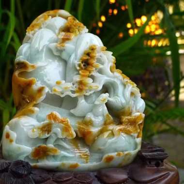翡翠A货老坑水润黄加绿精工人生如意花开富贵三彩摆件 裸石尺寸:250/205/30 连底坐:37