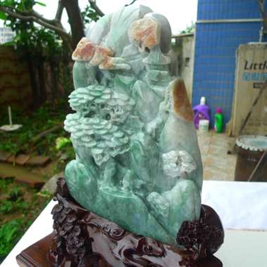 翡翠A货老坑俏色山水摆件 种水足,色俏点缀灵动,雕工精湛 裸石规格:232*180*50mm 含底座:365*290*146mm 重量:3.33kg