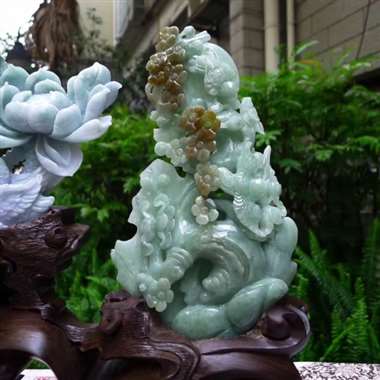 翡翠A货老坑水润飘绿精工和和美美双喜报春花瓶摆件 大约裸石尺寸:270/160/55 连底坐:380