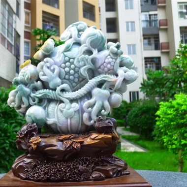 缅甸天然翡翠A货 精美水润 三彩 精美 花篮 福禄寿 多子多福 多子多福雕刻精美线条流畅种水好 搭配精美高档檀木底座 送礼佳品 尺寸 330.250.150裸石尺寸230.250.60裸石重量8.94斤 送礼佳品 送福