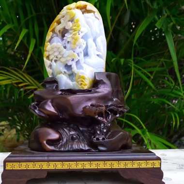 精美水润 飘花 满绿色 精美 人生如意 料子细腻水润 种水好 搭配精美高档檀木底座 尺寸 355.4