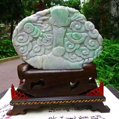 翡翠A货老坑水润浅绿精工府上有龙龙腾盛世摆件 约裸石尺寸:220/390/40 连底坐:450/39