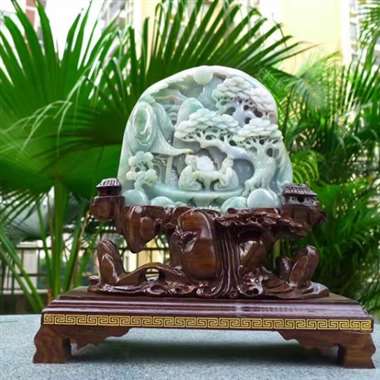 缅甸天然翡翠A货 精美春带彩 山水摆件 雕刻精美线条流畅种水好 层次分明 丰富多彩 搭配精美高档檀木