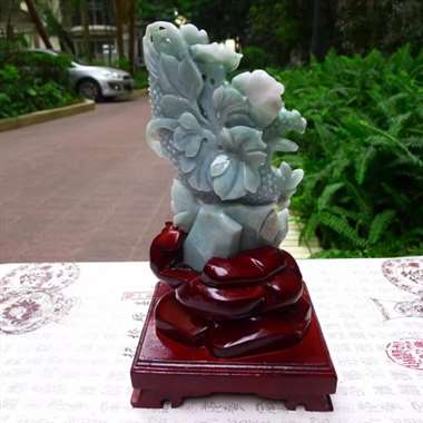 翡翠A货老坑水润飘绿精工花开富贵牡丹花瓶摆件 大约裸石尺寸:290/140/40 连底坐:400/2