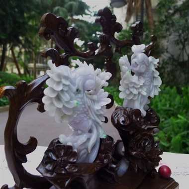 翡翠A货老坑水润浅绿精工花开富贵人生如意摆件 约裸石尺寸:240/240/60 连底坐:380/22