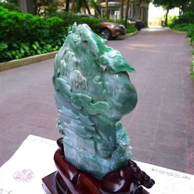 翡翠A货老坑水润浅绿精工生意兴隆摆件 约裸石尺寸:170/200/40 连底坐:320/230/4