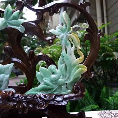 翡翠A货老坑水润飘绿精工荷花鱼三生缘荷花摆件 约裸石分别尺寸:200/150/50*220/130/