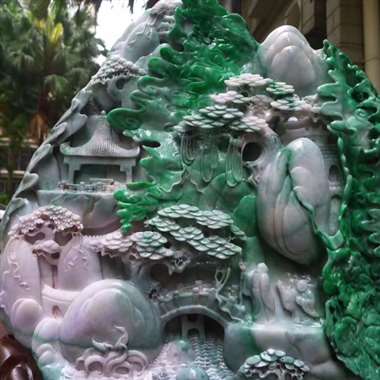 翡翠A货老坑水润飘阳绿精工深山访友,老少同乐山水摆件约裸石尺寸:360/400/95 连底坐:590/480/220mm 重量:33.5斤