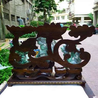 翡翠a货精雕阳绿山水,蒸蒸日上洪福齐天摆件。裸石尺寸约250,155,45,摆好连底座高度约360,