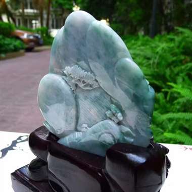大件山水 缅甸天然翡翠A货 精美春带彩 山水摆件 雕刻精美线条流畅种水好 层次分明 丰富多彩 搭配精