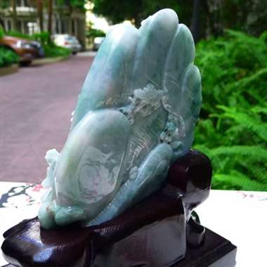 翡翠A货老坑水润飘花精工指日高升山子摆件 约裸石尺寸:143/126/34mm 重量:870g