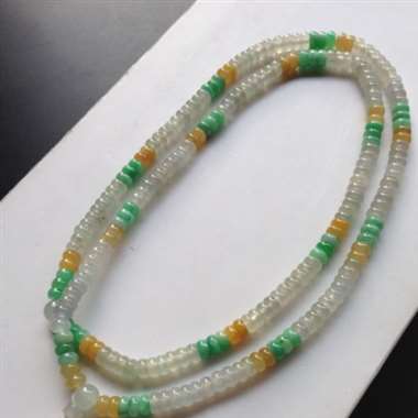 冰种三彩珠链,玉质细腻、个别有点裂纹、上身效果更美。