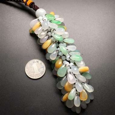 冰种三彩项链、玉质细腻光滑、个别有裂纹、上身效果更佳。