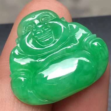甜绿坐佛,尺寸:19.8*22.3*4.1mm,完美,满色,种好水头,水润色甜绿,品相佳,笑脸开怀。H16