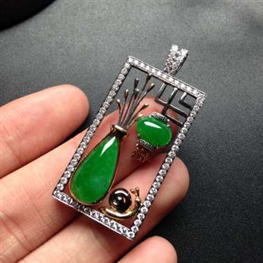 冰种满色阳绿吊坠 18K金镶嵌 连金尺寸31-21-7毫米