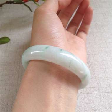 翡翠A货50.8圈口手镯,白冰飘花带黄皮,完美圆条,质地纯净冰透起胶!