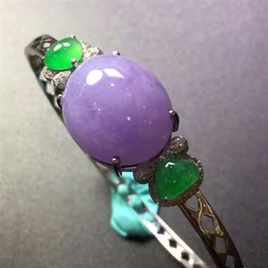 紫罗兰双色手镯,粉粉的紫色大蛋面搭配正阳绿蛋面,高贵大气,紫色蛋面规格:18.5*15*11.2mm