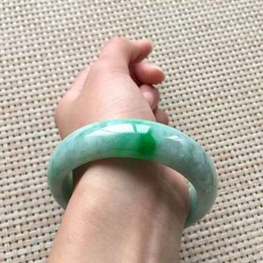 冰糯种飘花手镯,内有一色根,不扣手,玉质细腻,无纹裂。圈口:57.0。尺寸:17.4-8.0