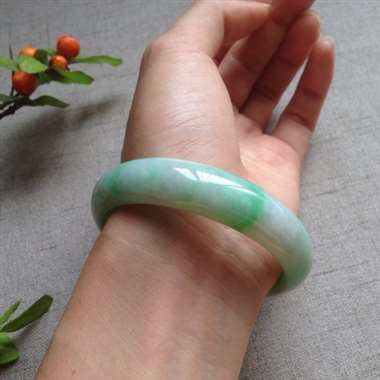 天然翡翠A货56.5圈口手镯,整体有底色,飘阳绿,质地细腻,淡豆色,完美圆条手镯!