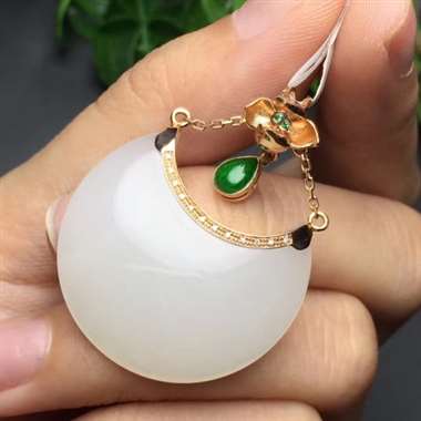 18k金镶和田白玉吊坠 顶级青海料 白白润润,款式精美, 蛋面尺寸约28mm金重1.72g 蛋面重6.57g款式新颖,高端大气上档次