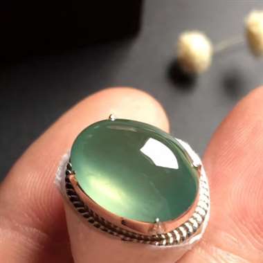 4-14,高冰晴水戒面,底托为铜,种老起胶,肉质细腻,起荧光,品相饱满,镶嵌后价值倍增,尺寸14.8