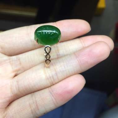 和田碧玉戒指,精致小巧,18k金镶嵌,玉质温润,碧绿通透水润,水头十足,款式小巧精美,上手效果棒棒哒。主石规格10*14mm 款号2-1311958