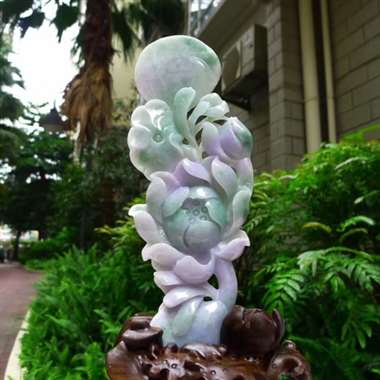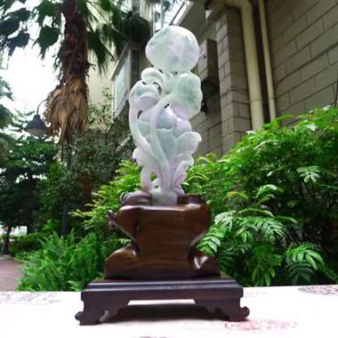 翡翠A货老坑水润春带彩和和美荷花摆件约裸石尺寸:240/85/15 连底坐:350/165/110m