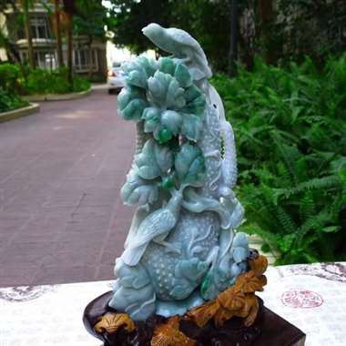 翡翠A货阳绿精雕和和美美,富贵吉祥大气,荷花仙鹤摆件 规格:左:265*220*60(高*宽*厚)右