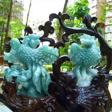 特色带底色 英明神武 比翼双飞 成双成对 摆件 寓意好 种水杠杠 栩栩如生 颜色靓丽 精巧 线条优美 立体感强 配送精美檀木底座 送礼收藏佳品。裸石尺寸115/90/30-100/60/28 整体尺寸260/240/105 重量0.55 KG