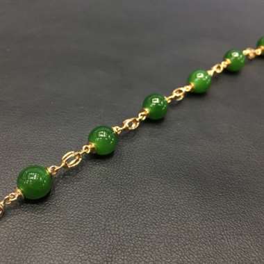 和田玉18k金碧玉手链,唯妙唯俏,做工精致,典雅的玫瑰金色彩,颗颗精选优质的碧玉珠子,颜色碧绿,充满朝气,玉质温润,水润十足,太阳光下照射更加美丽动人。总长度220mm 珠子约8mm