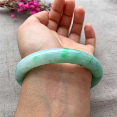 60.3圈口正圈飘绿平安镯,难得的大圈口,上效果很棒,略有点石纹,不影响佩戴和保存