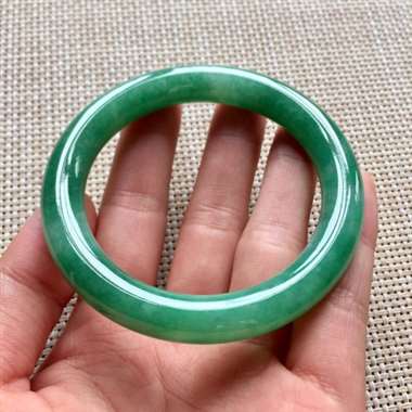翡翠A货56圈口圆条手镯, 正装阳绿,有些许裂纹, 不影响佩戴!